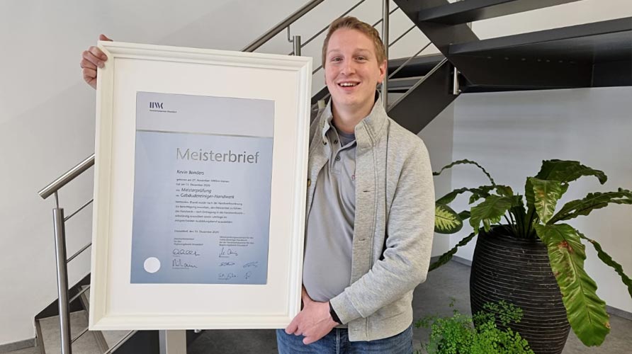 Kevin Benders hält stolz die Meisterurkunde des Gebäudereiniger-Handwerks in den Händen. Der 31-jährige Familienvater aus Grefrath hat in den vergangenen Jahren eine beachtliche Entwicklung durchlaufen. Mitte 2009 begann er bei Ludwigs seine Handwerksausbildung zum Gebäudereiniger, die er im Jahr 2012 erfolgreich beendete. Noch im gleichen Jahr übernahm der damals 22-Jährige die Position des Vorarbeiters für den Bereich der Glas- und Sonderarbeiten. Im Jahr 2016 begann er berufsbegleitend die Meisterausbildung, die er jetzt erfolgreich bei der Handwerkskammer Düsseldorf abschloss. Seit Anfang des Jahres ist er Mitglied der technischen Betriebsleitung bei Ludwigs. Die Meisterurkunde hat in seinem Büro einen Ehrenplatz erhalten und…